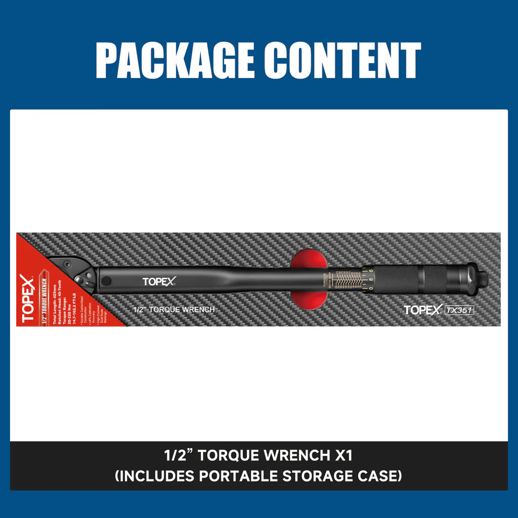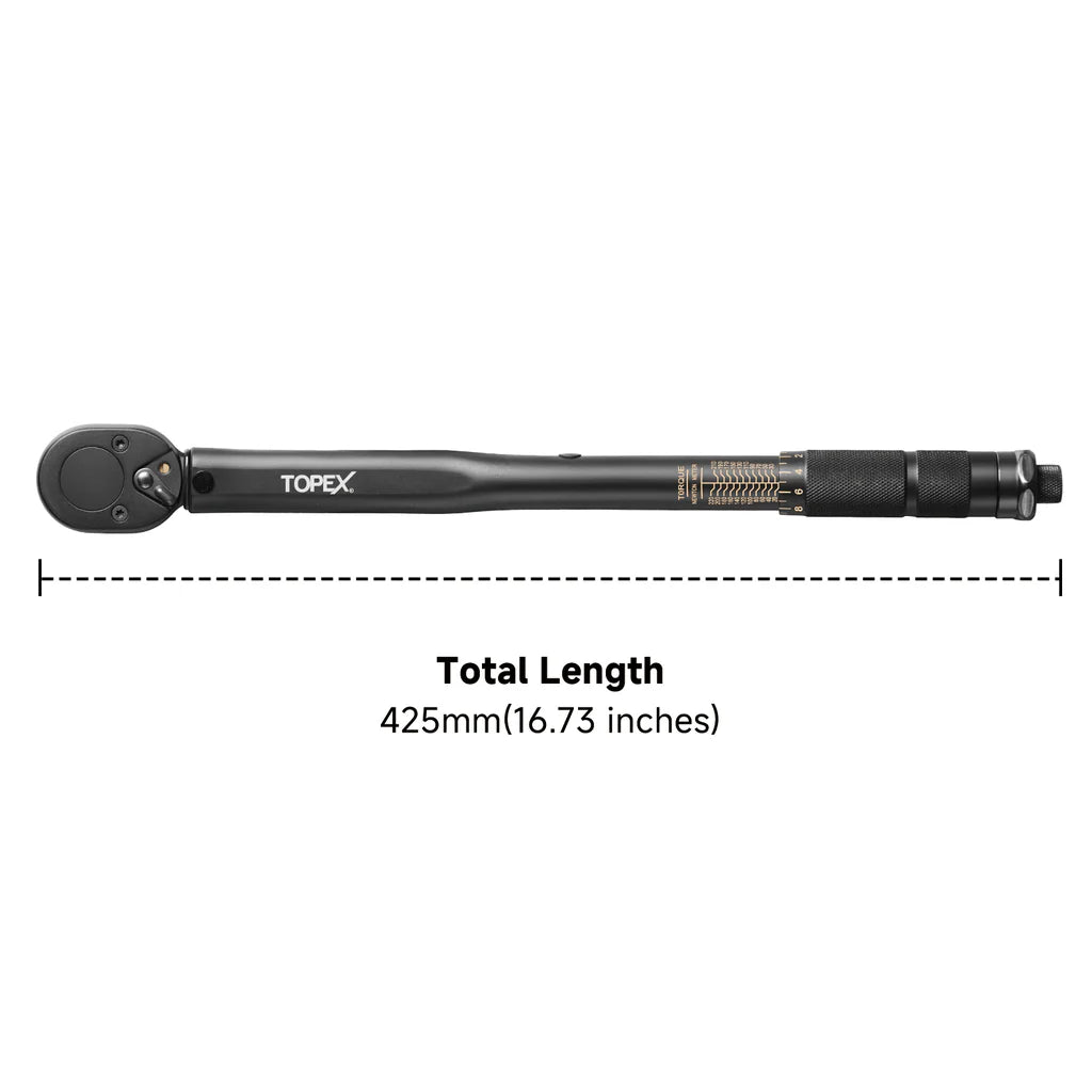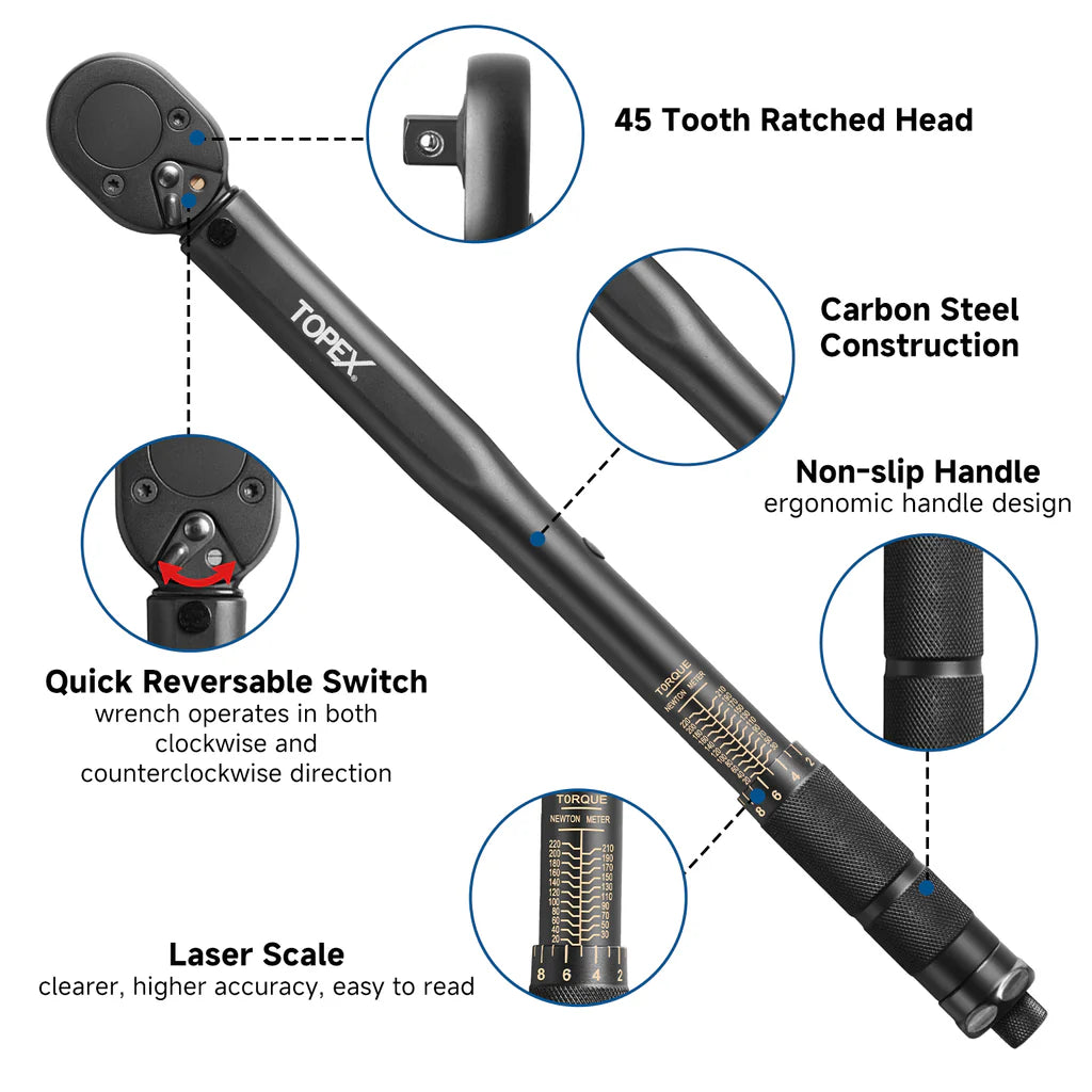 TOPEX 1/2" Torque Wrench, 20-220 Nm / 14.7-162.2 ft-lb, Dual Scale, Heavy Duty for Automotive & Mechanical Use