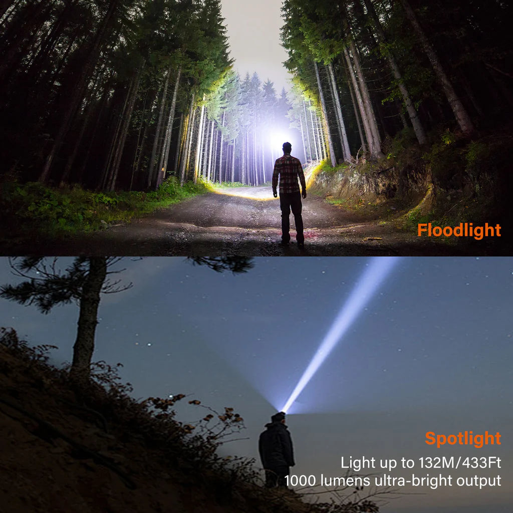 - [Ultra-Bright 1000-Lumen Output]Delivers powerful illumination with 132m beam distance, perfect for nighttime activities like hiking, camping, or repairs.